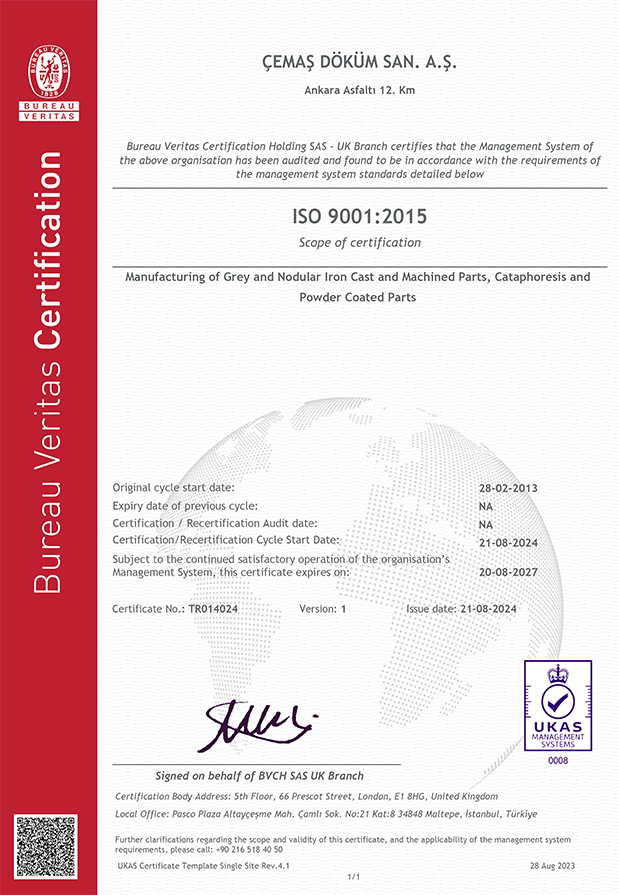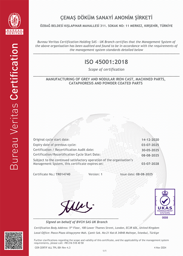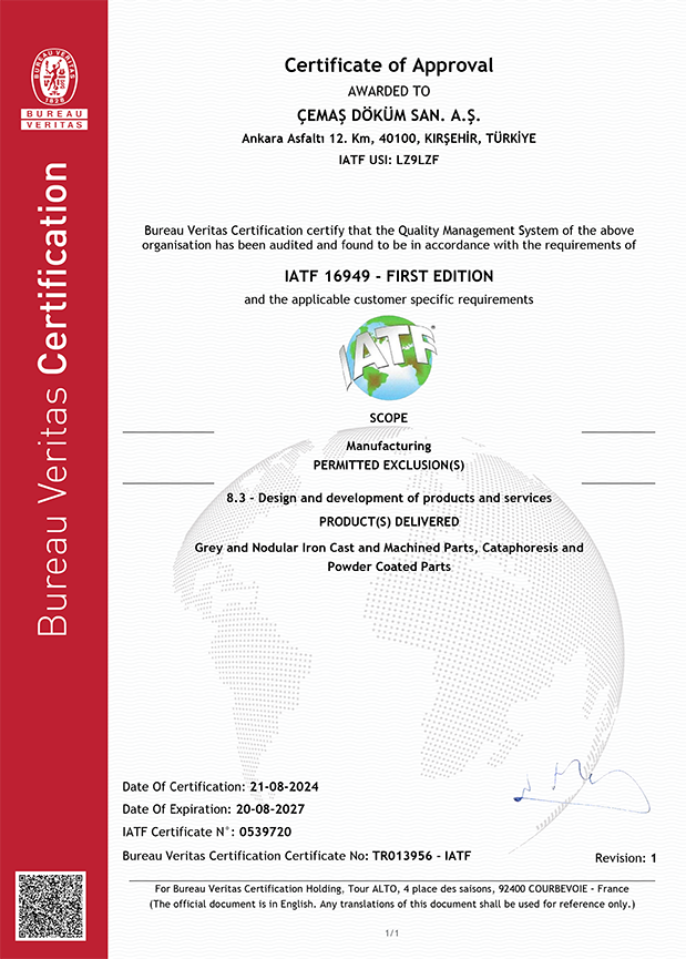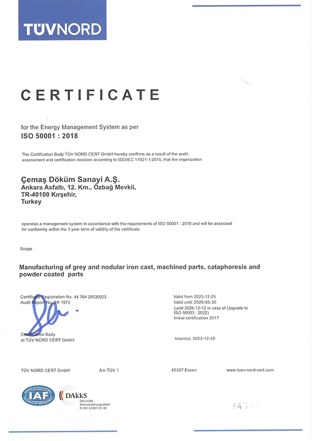 Şirketimiz uygulamakta olduğu IATF 16949 Kalite Yönetim Sistemi, ISO 45001 Yönetim Sistemini, ISO 14001 Çevre Yönetim Sistemini ve ISO 50001 Enerji Yönetim Sistemini oluşturduğu Çevre, İSG ve Enerji Politikası ve Kalite Politikası ile desteklemektedir.